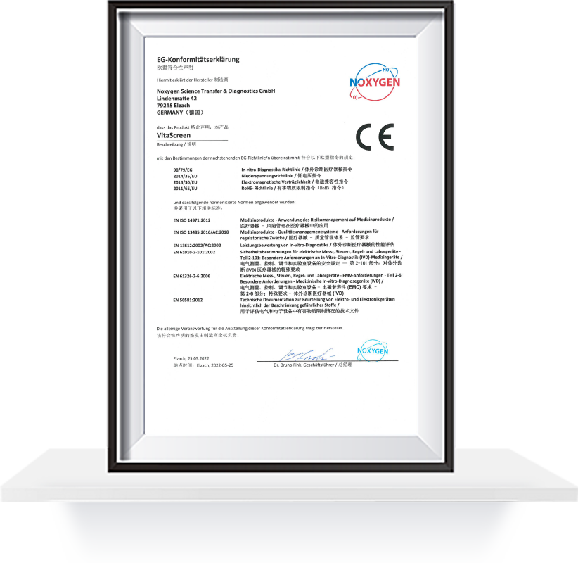VitaScreen is a standalone analyzer based on Electron Paramagnetic Resonance (EPR) technology. The CMA represents the formation of reactive oxygen species in the mitochondrial respiratory chain and oxido-reductive enzymatic systems, as well as through cytokine-dependent activation of inflammatory cells.